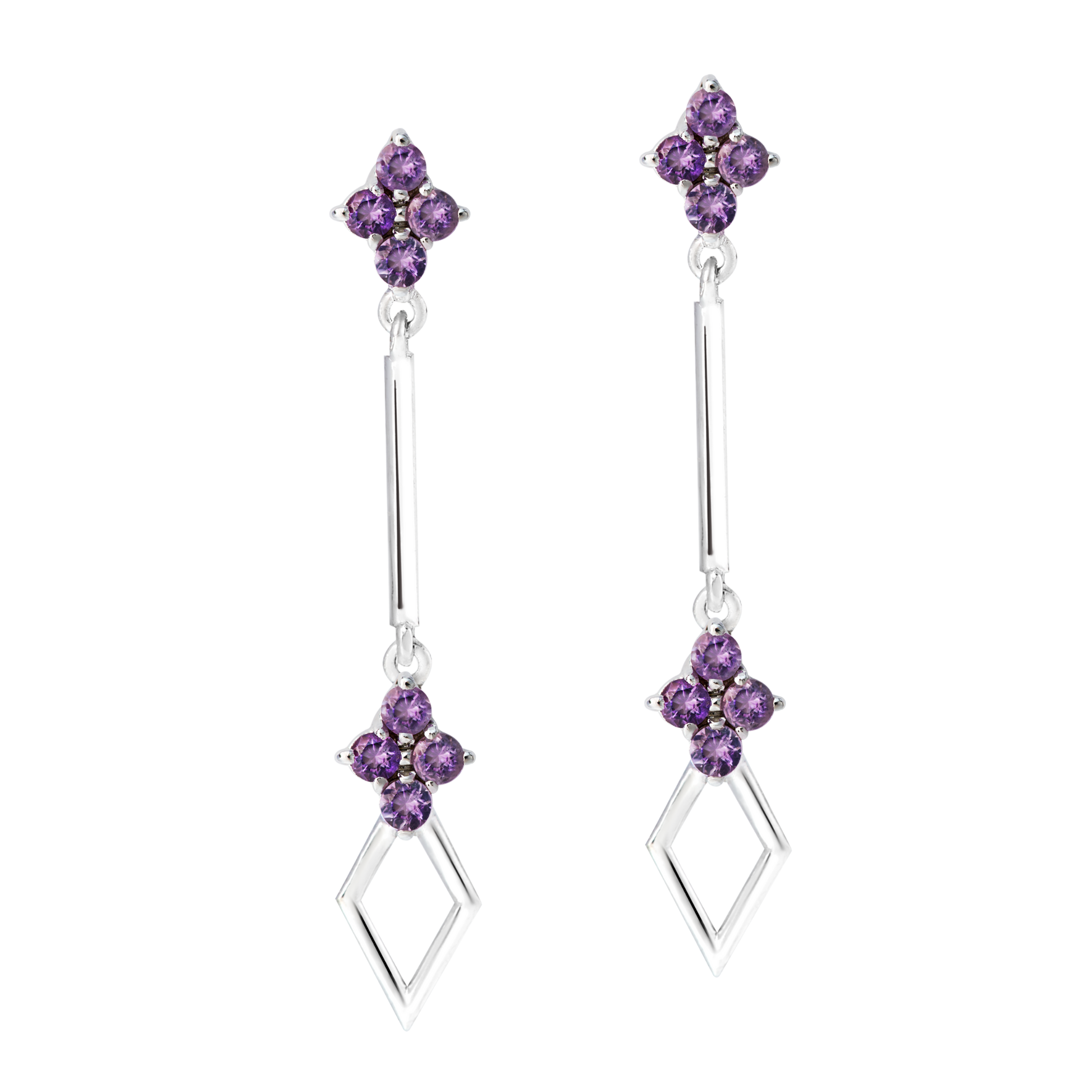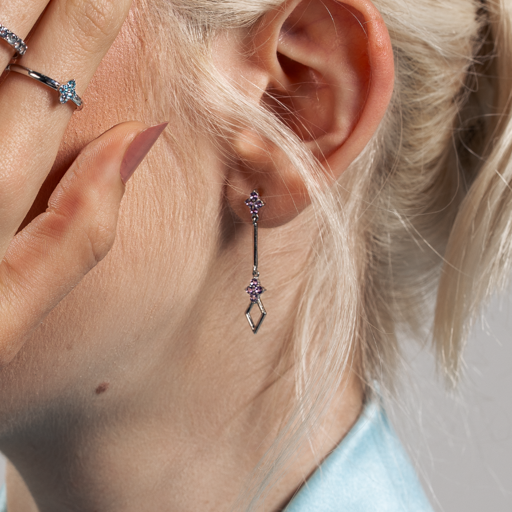 Com um design exclusivo e equilíbrio perfeito, este brinco de tamanho médio oferece o impacto visual ideal. A Ametista, em dois elementos cravejados interligados, cria um movimento sutil que ilumina o rosto com um tom violeta intenso.
