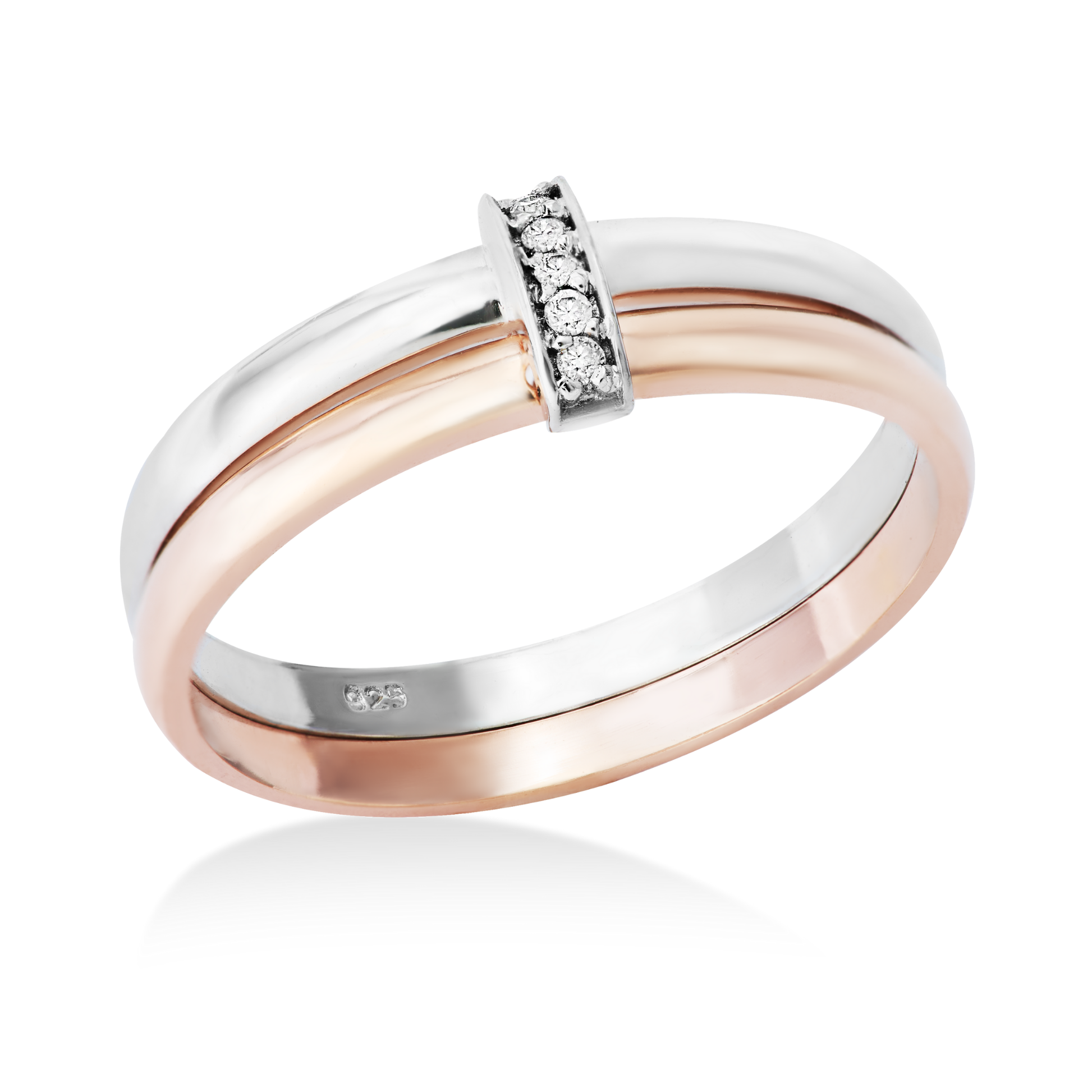 O design é composto por dois aros que se cruzam harmoniosamente: um aro em Prata 925 com acabamento polido (prateado claro) e outro com um elegante banho de ouro rosé, criando um sofisticado contraste bicolor.