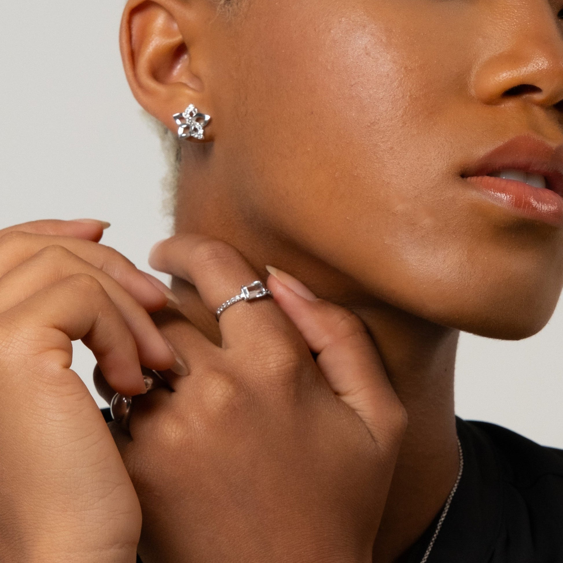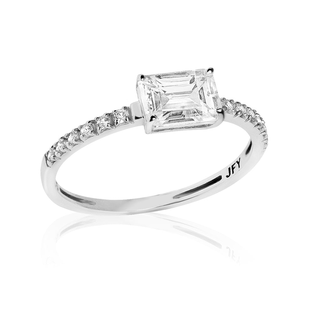 Sofisticação em cada detalhe. Este anel une o design clássico do solitário com a modernidade da lapidação retangular (Emerald Cut). O brilho cristalino do Topázio Branco central é intensificado pela cravação lateral da mesma gema, criando uma joia que ilumina o visual com delicadeza e poder.