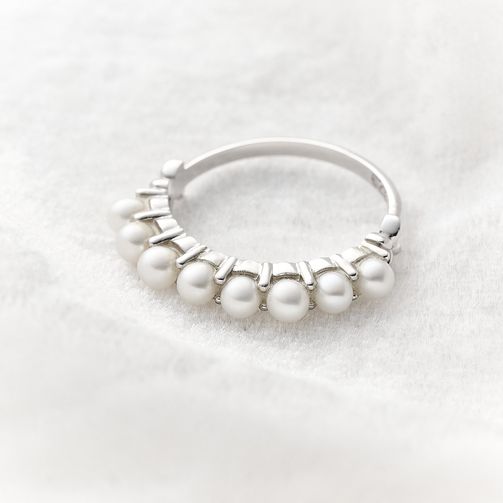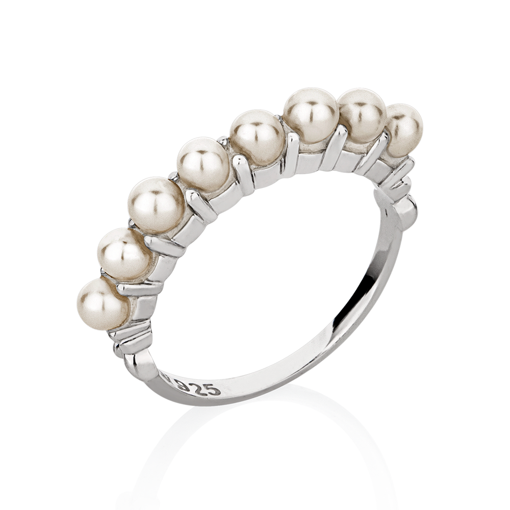 Este anel celebra a beleza atemporal das pérolas em uma releitura moderna e feminina. Com um design de meia aliança, a peça apresenta uma sequência harmoniosa de pérolas selecionadas que envolvem o dedo com suavidade, criando uma joia que ilumina o visual com delicadeza e poder. Perfeito para ser usado sozinho como protagonista ou em composições elegantes com outros anéis de prata.