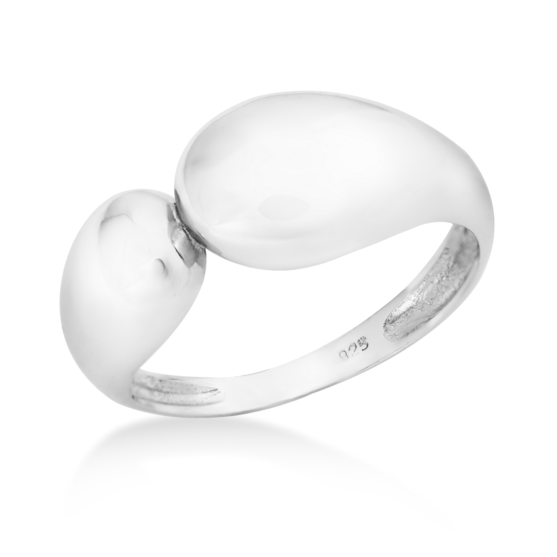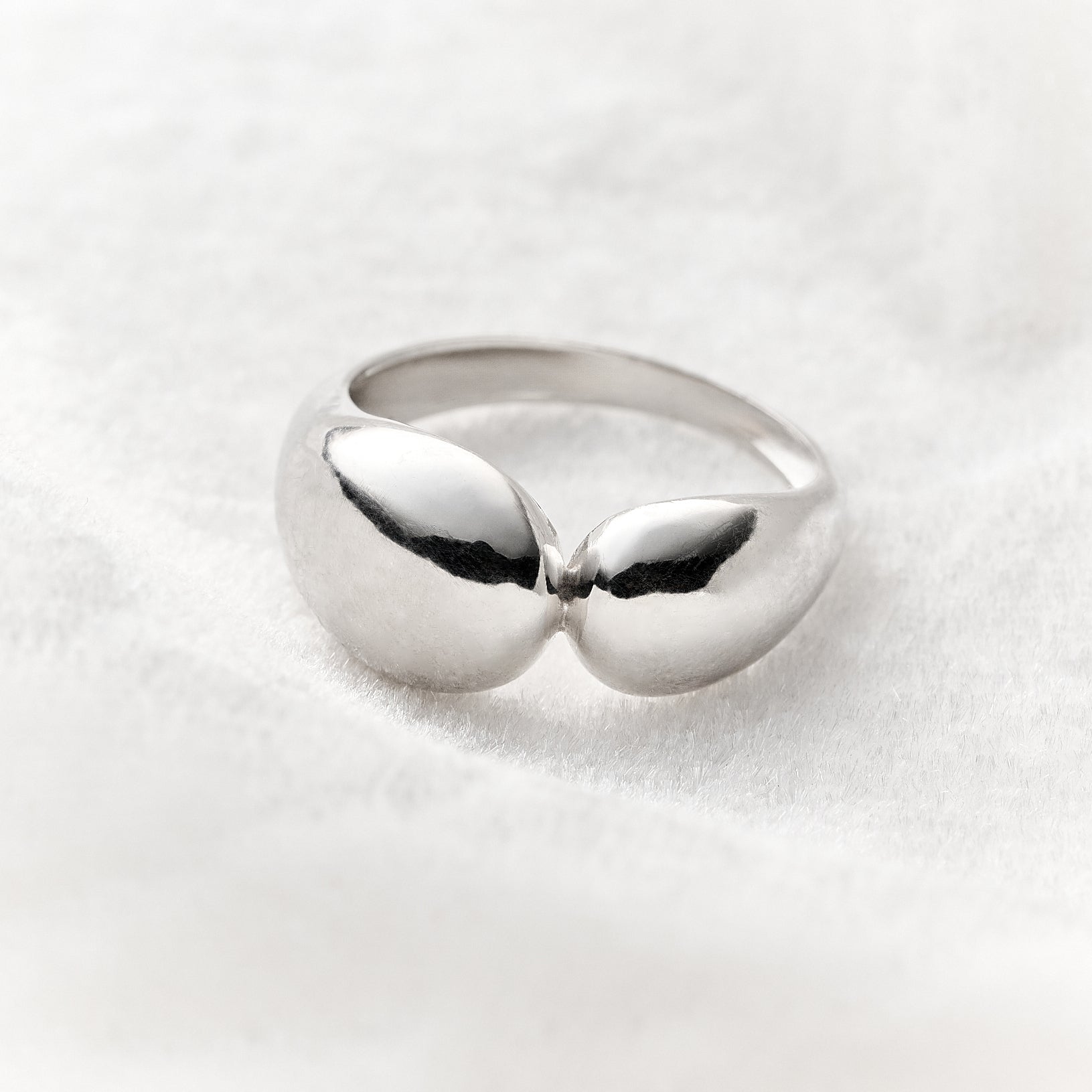 O topo do anel é composto por duas formas abauladas e lisas, que se assemelham a gotas interligadas ou formas fluidas que se abraçam. O volume e o formato bold criam uma peça de destaque, enquanto o acabamento altamente polido confere um brilho intenso e sofisticado. O aro é confortável e robusto, garantindo durabilidade.