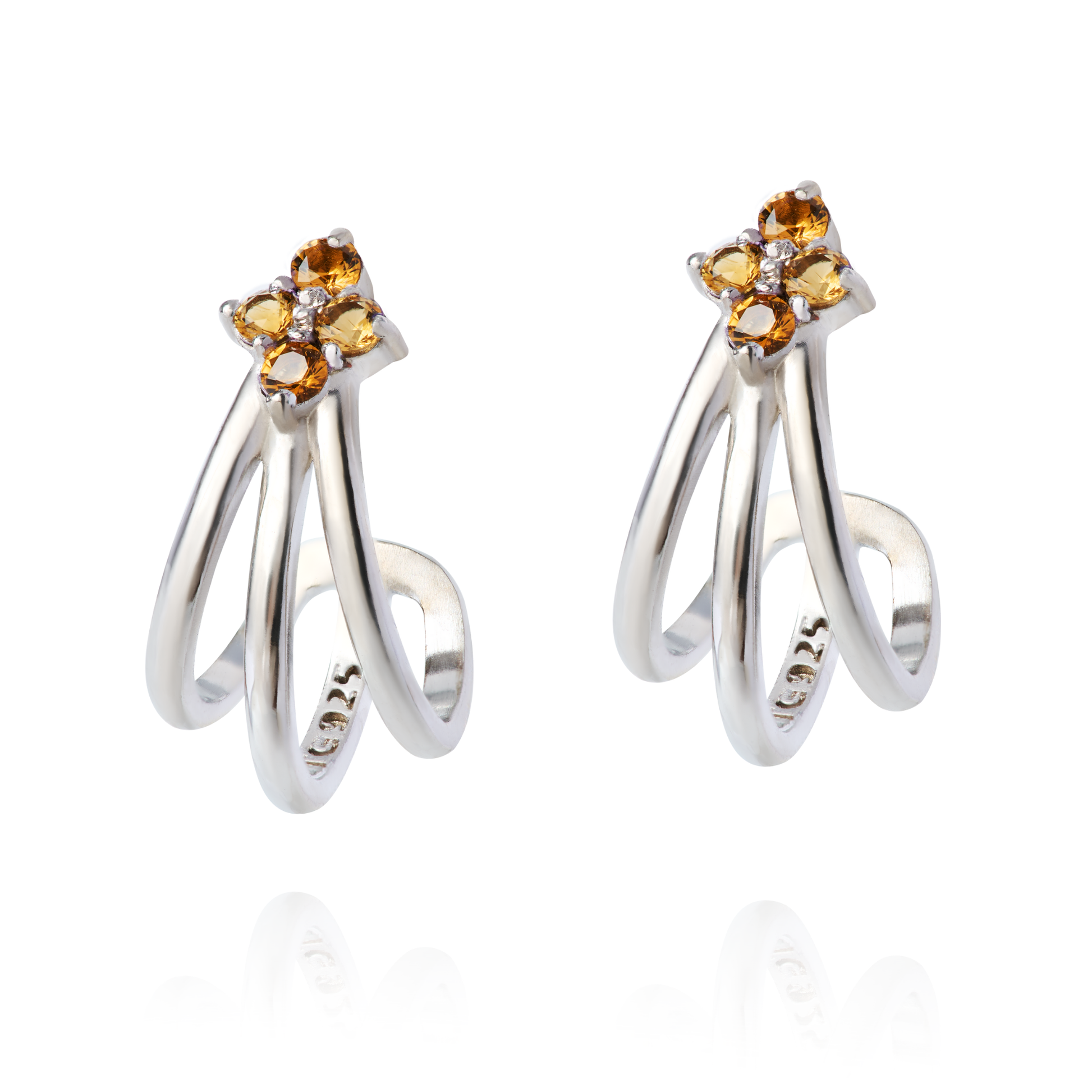 Um design exclusivo que é pura arte escultural. Este brinco combina a forma orgânica da flor cravejada em Citrino vibrante com um aro triplo em Prata 925, criando um efeito 3D luxuoso que abraça a orelha.