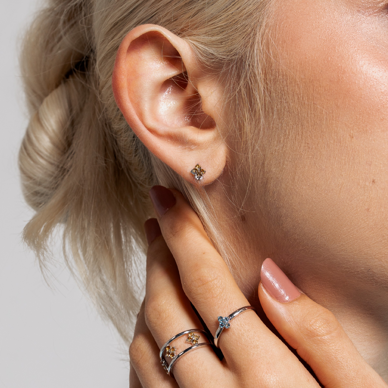 "Um ponto de energia e prosperidade. Este brinco de pino possui um design exclusivo e compacto, utilizando a força do Citrino em um formato cravejado que irradia luz dourada.