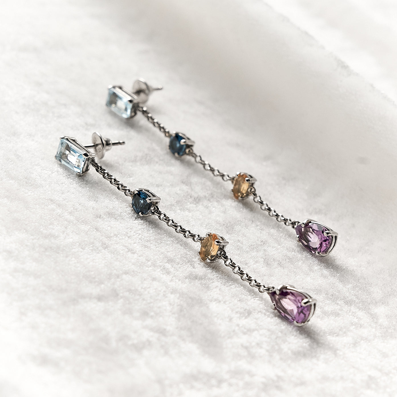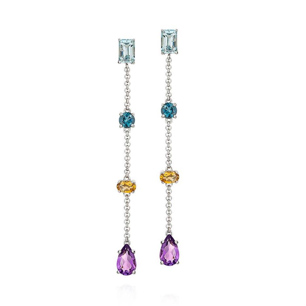 As gemas da coleção Colorful são verdadeiras expressões de beleza e vivacidade da natureza brasileira. Estes brincos reúnem uma curadoria luxuosa de pedras naturais, combinando diferentes formas e tonalidades para criar um espetáculo visual de luz e cor. A harmonia entre os tons de azul dos Topázios, o calor do Citrino e a profundidade da Ametista resulta em uma joia que ilumina o rosto com delicadeza e poder, sendo a escolha perfeita para mulheres que buscam exclusividade e design contemporâneo.