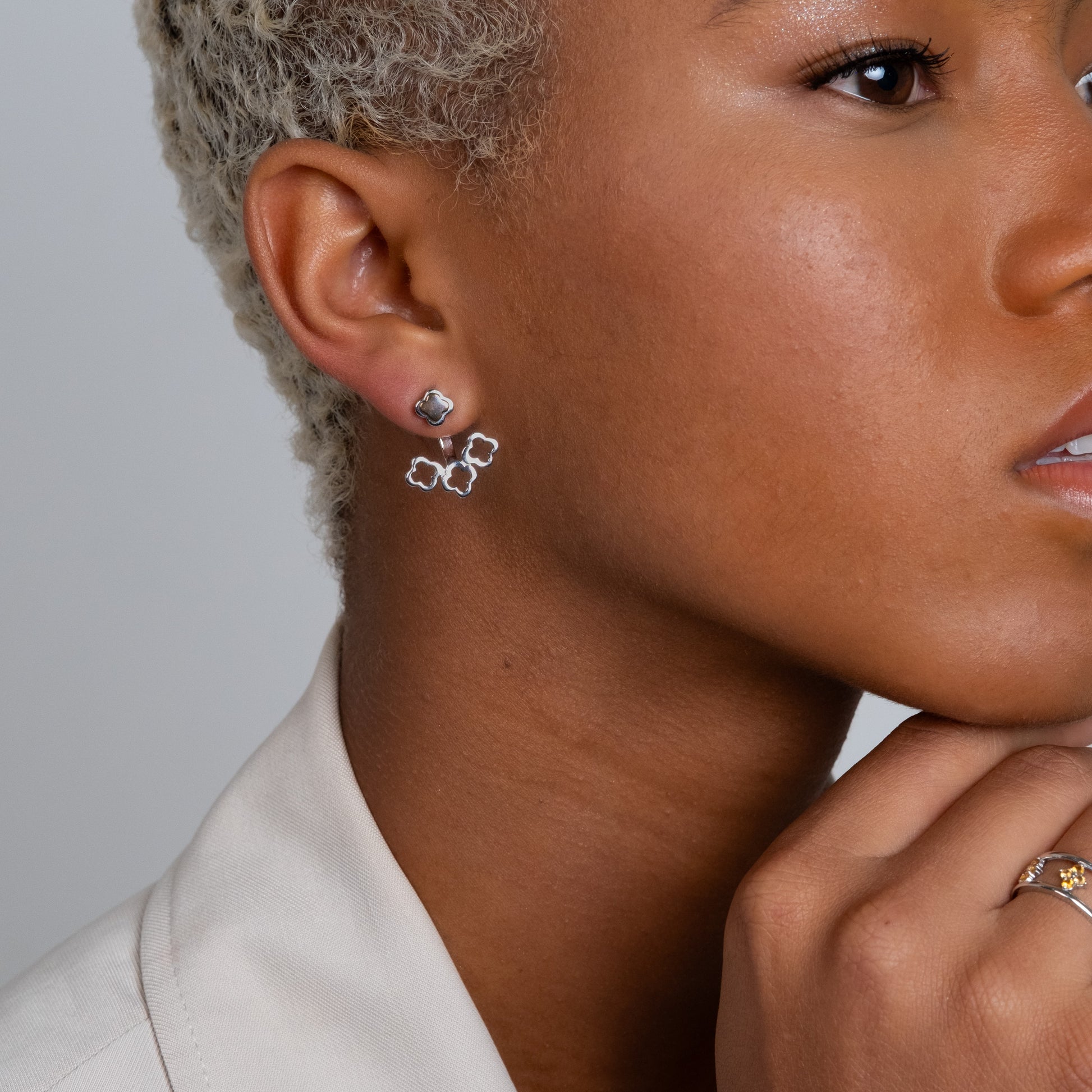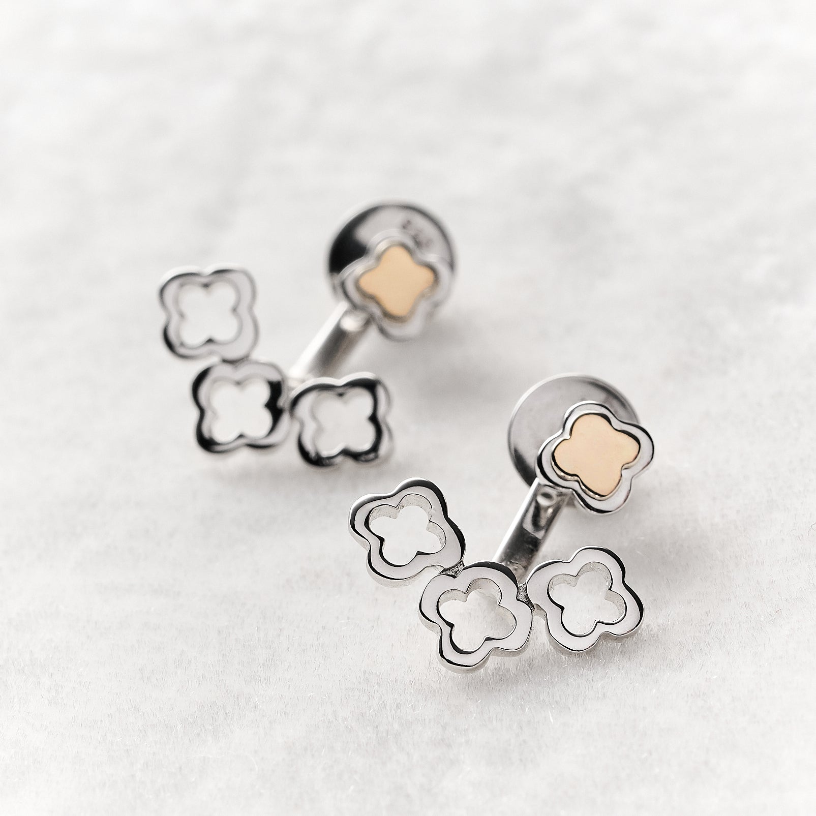 A Coleção Romantic apresenta uma joia que une a elegância clássica da prata à luxuosidade cintilante do ouro. Com um design moderno, o brinco apresenta trevos delicados que contornam a orelha com um movimento arquitetônico, criando uma peça que ilumina o rosto com delicadeza e poder. A combinação do banho de ródio com o detalhe em ouro 18K torna esta peça um item indispensável para quem busca um visual romântico e contemporâneo.