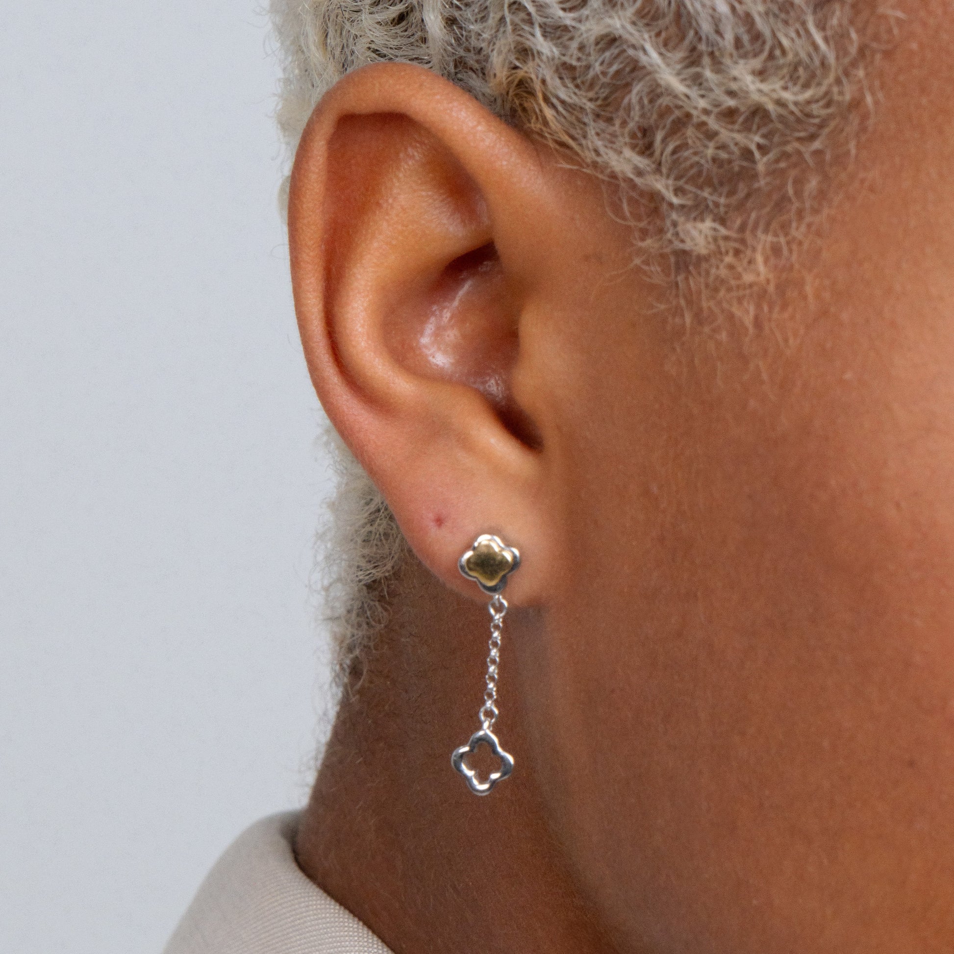 Evocando o amor e a paixão, estes brincos da Coleção Romantic unem a elegância clássica da prata e do ouro. Com um design alongado e articulado, a peça apresenta trevos vazados que descem graciosamente, culminando em um detalhe central banhado em ouro 18K que ilumina o rosto com delicadeza e poder. É a escolha ideal para quem busca uma joia de impacto que transborda romantismo e refinamento contemporâneo.