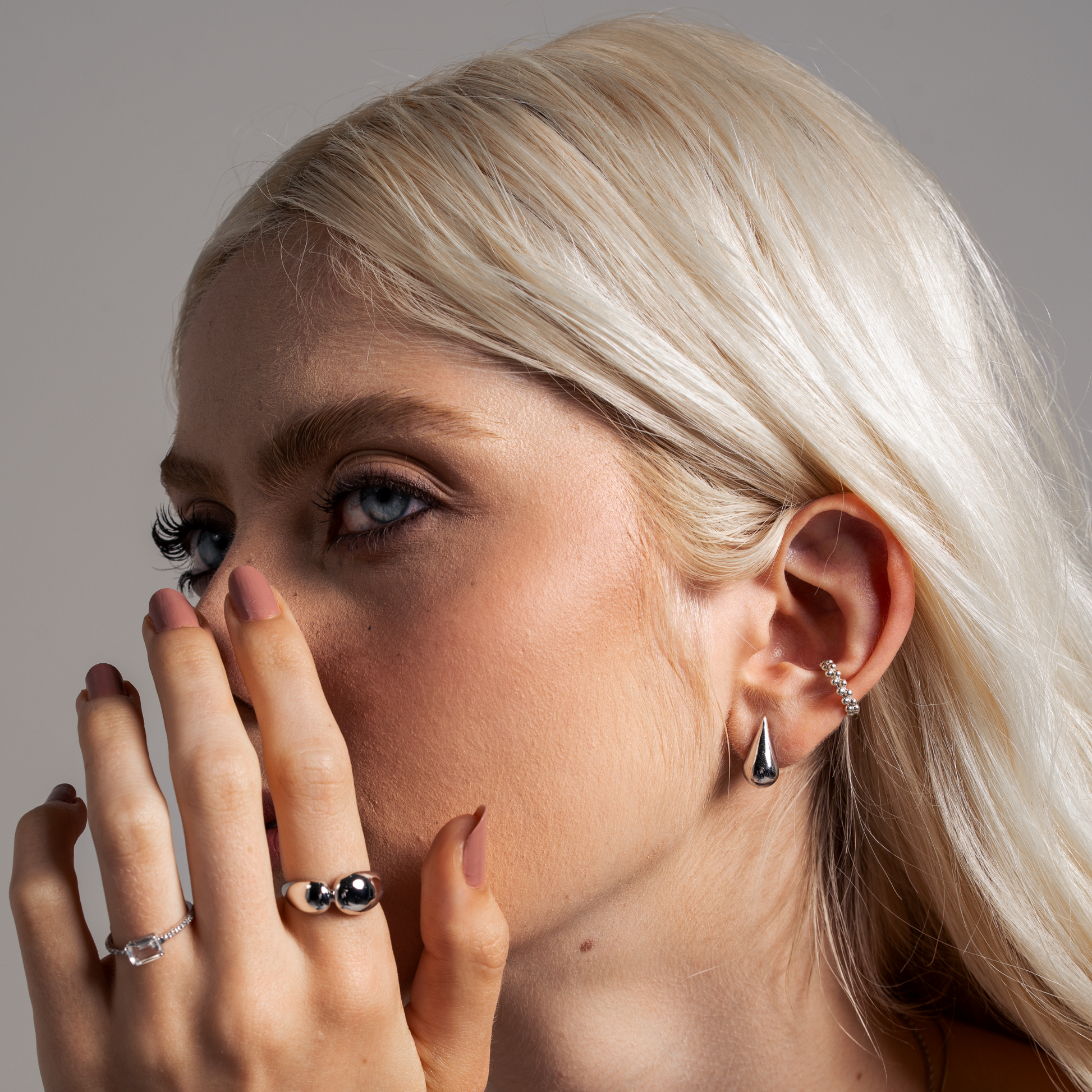 As gotas possuem um acabamento espelhado e altamente polido, garantindo um brilho intenso que reflete a luz de maneira elegante. Com volume discreto, o formato minimalista e orgânico é perfeito para criar um visual moderno, sendo uma das tendências mais fortes da joalheria. São peças selecionadas e lapidadas com cuidado, ideais para quem busca uma joia de impacto sem perder a elegância.