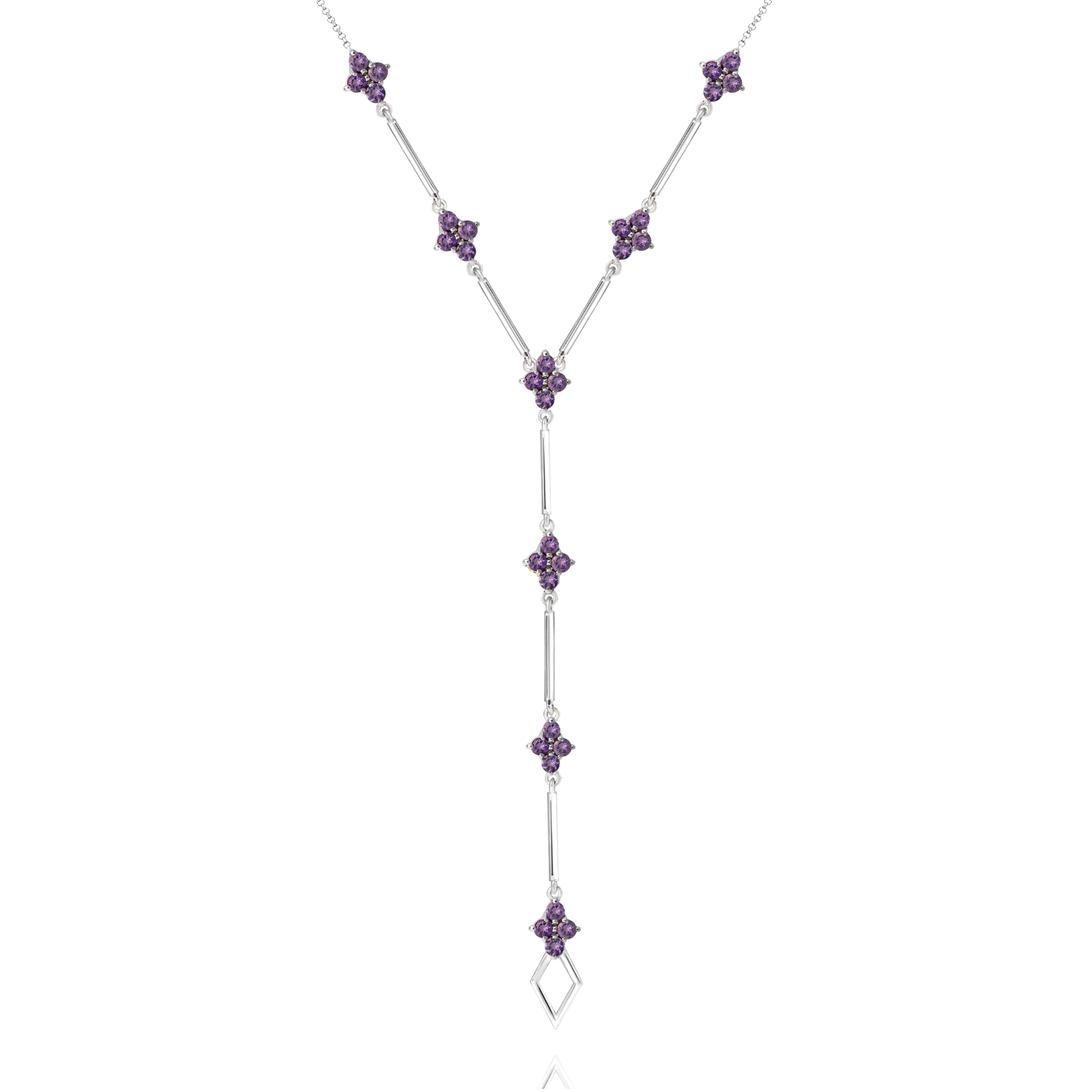 Um design exclusivo em formato Gravatinha que combina sofisticação geométrica com o brilho místico da Ametista. O colar é composto por múltiplos elementos cravejados interligados por barras de metal, desenhando uma linha vertical que alonga a silhueta.