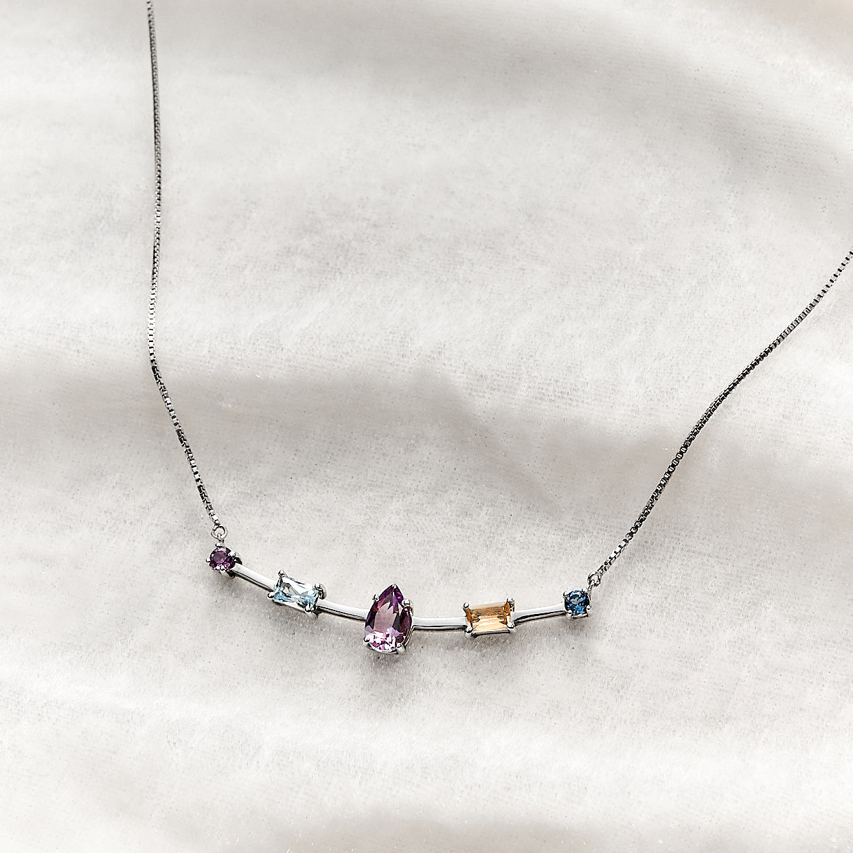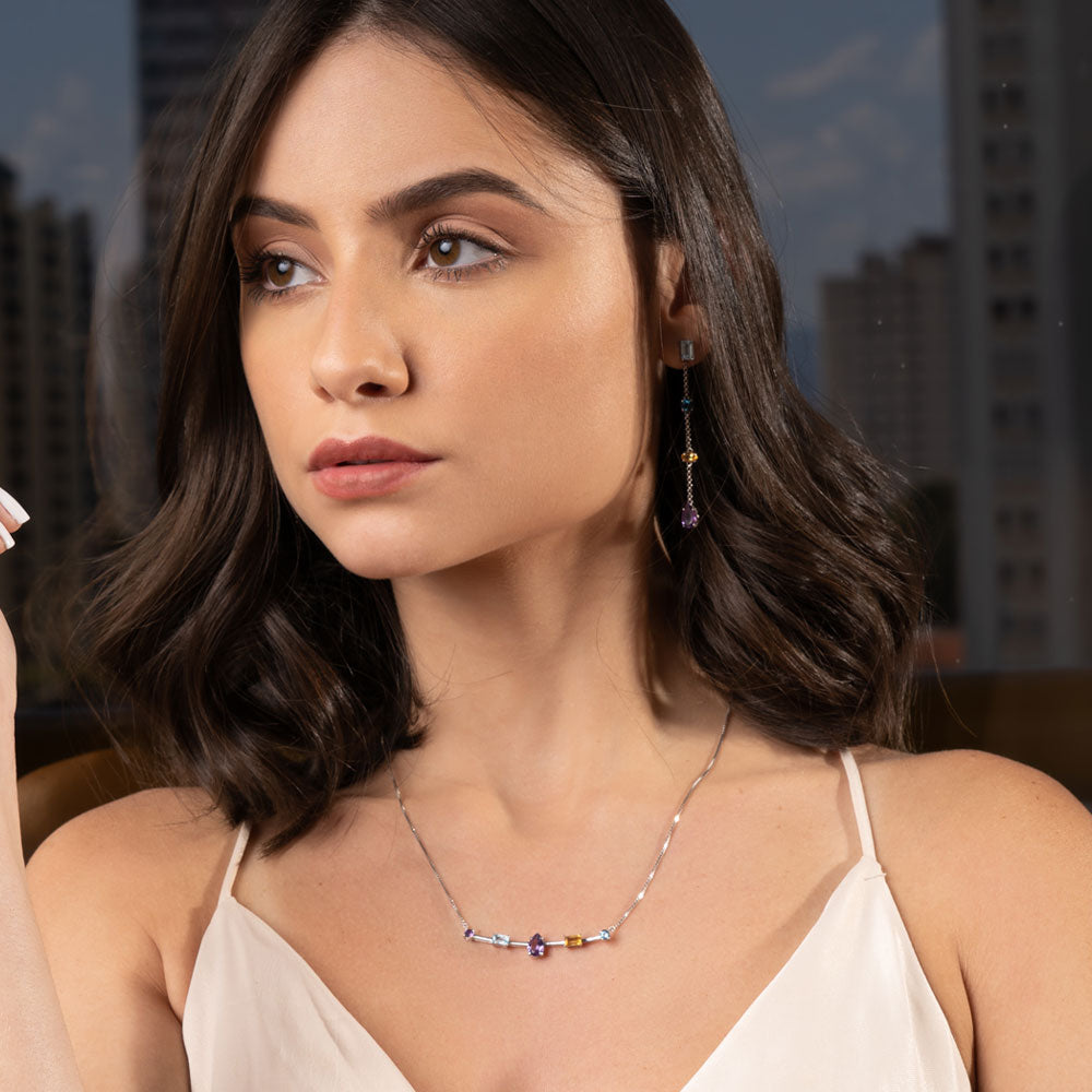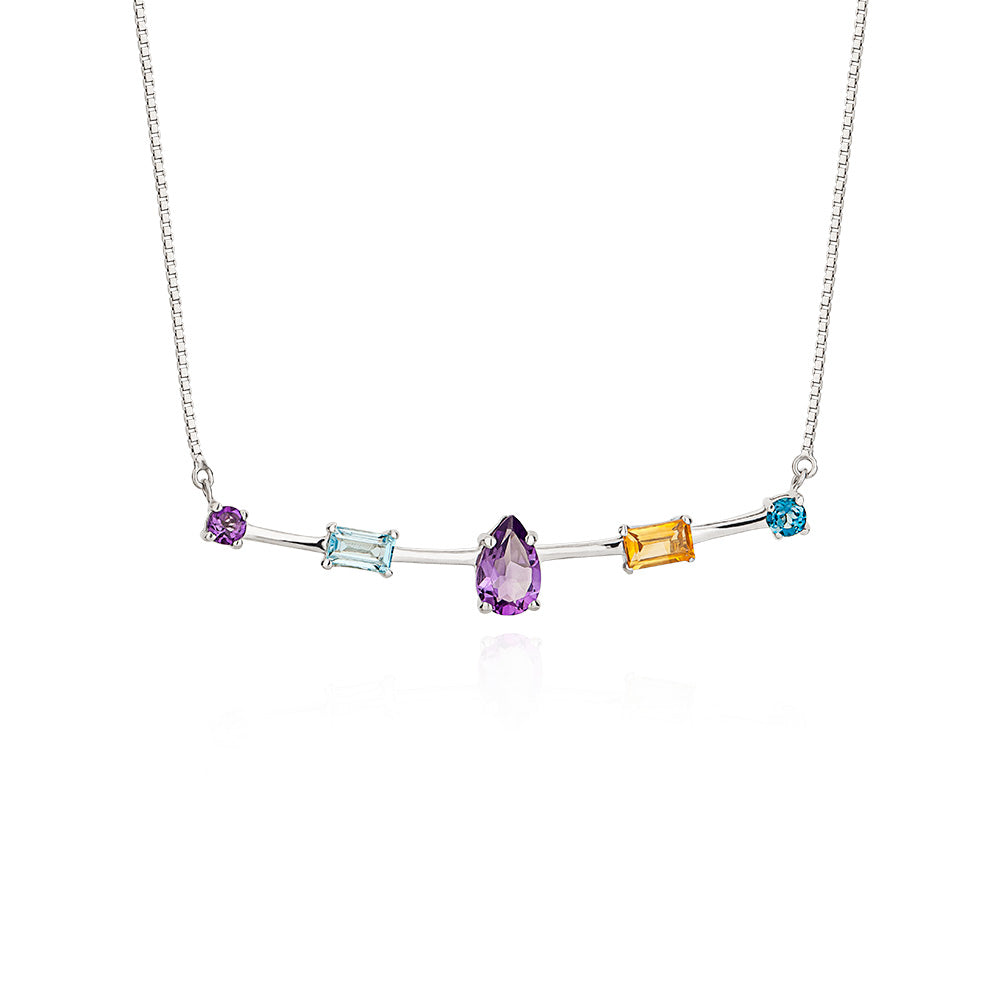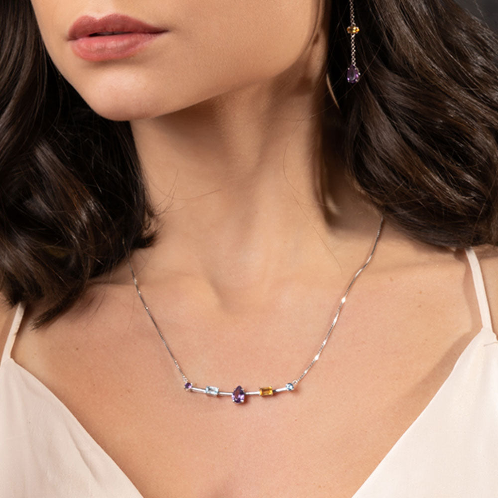 Colar em Prata 925 com Topázio Sky retangular 5x3; Topázio London redondo 3mm; Citrino Oval 3x5; Ametista Gota 5x8. Com banho de ródio.