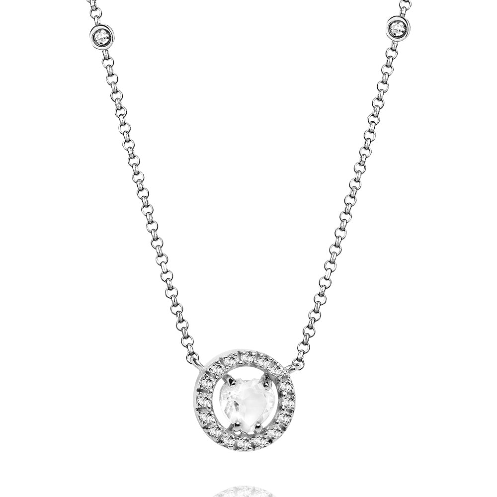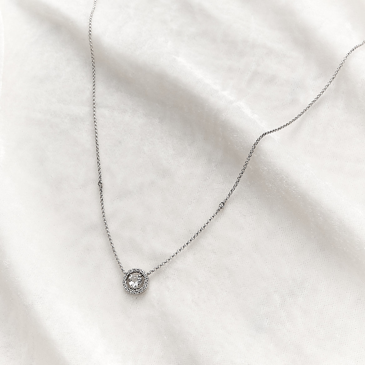Gemas Adjacentes: Micro Topázios Brancos selecionados na moldura e corrente.