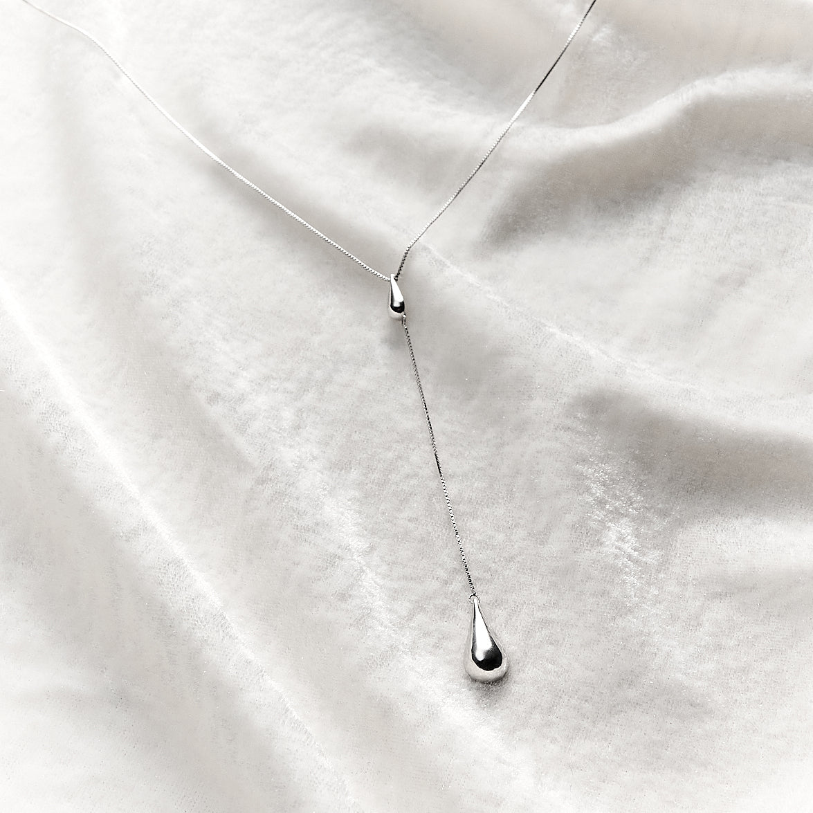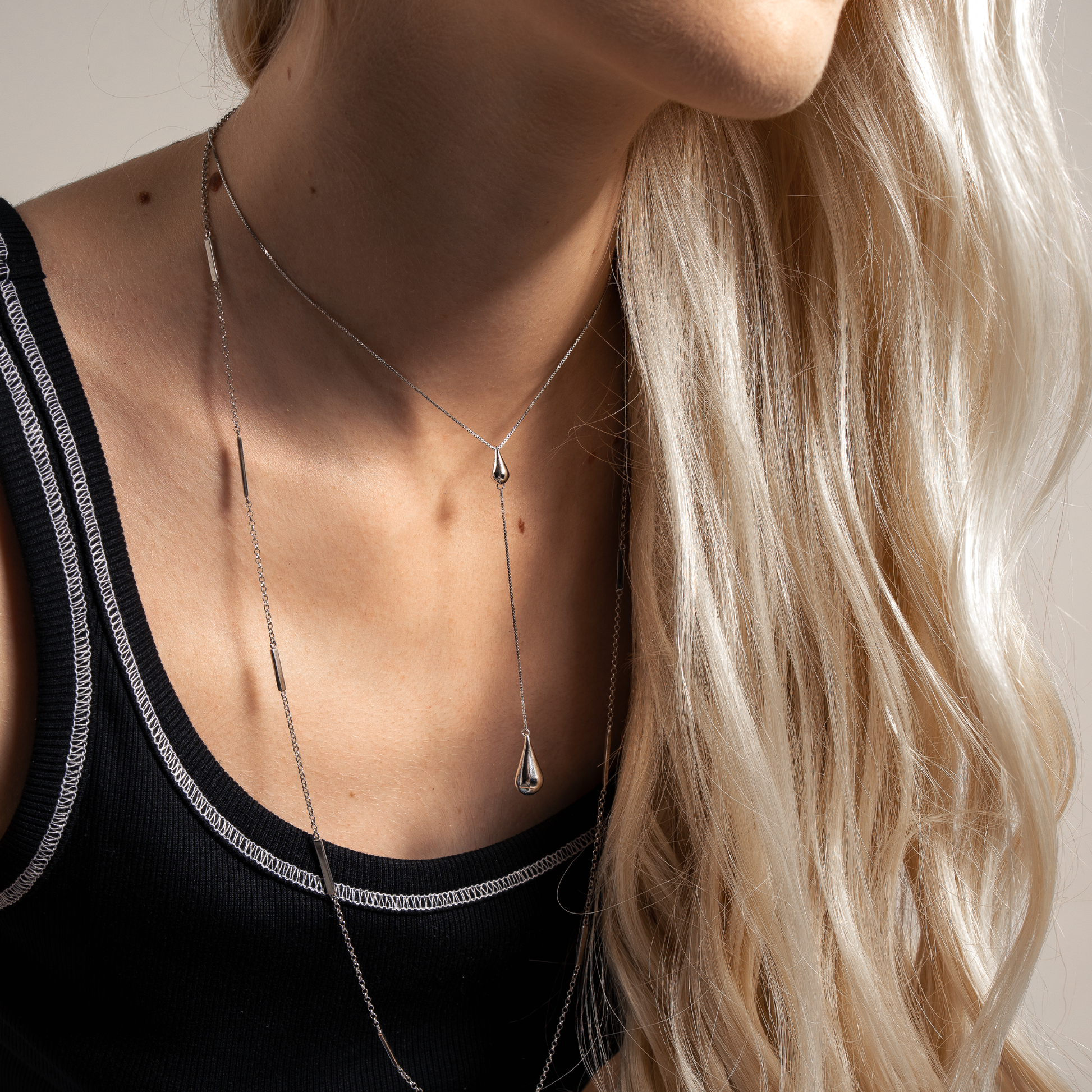 O design se destaca pela elegância da corrente fina e delicada, que se divide em uma seção mais longa e vertical. O colar possui duas gotas lisas e abauladas, com acabamento polido de alto brilho: uma menor no ponto de separação, e uma maior e volumosa na extremidade do pendente. A fluidez da peça cria um efeito alongador e contemporâneo no decote.