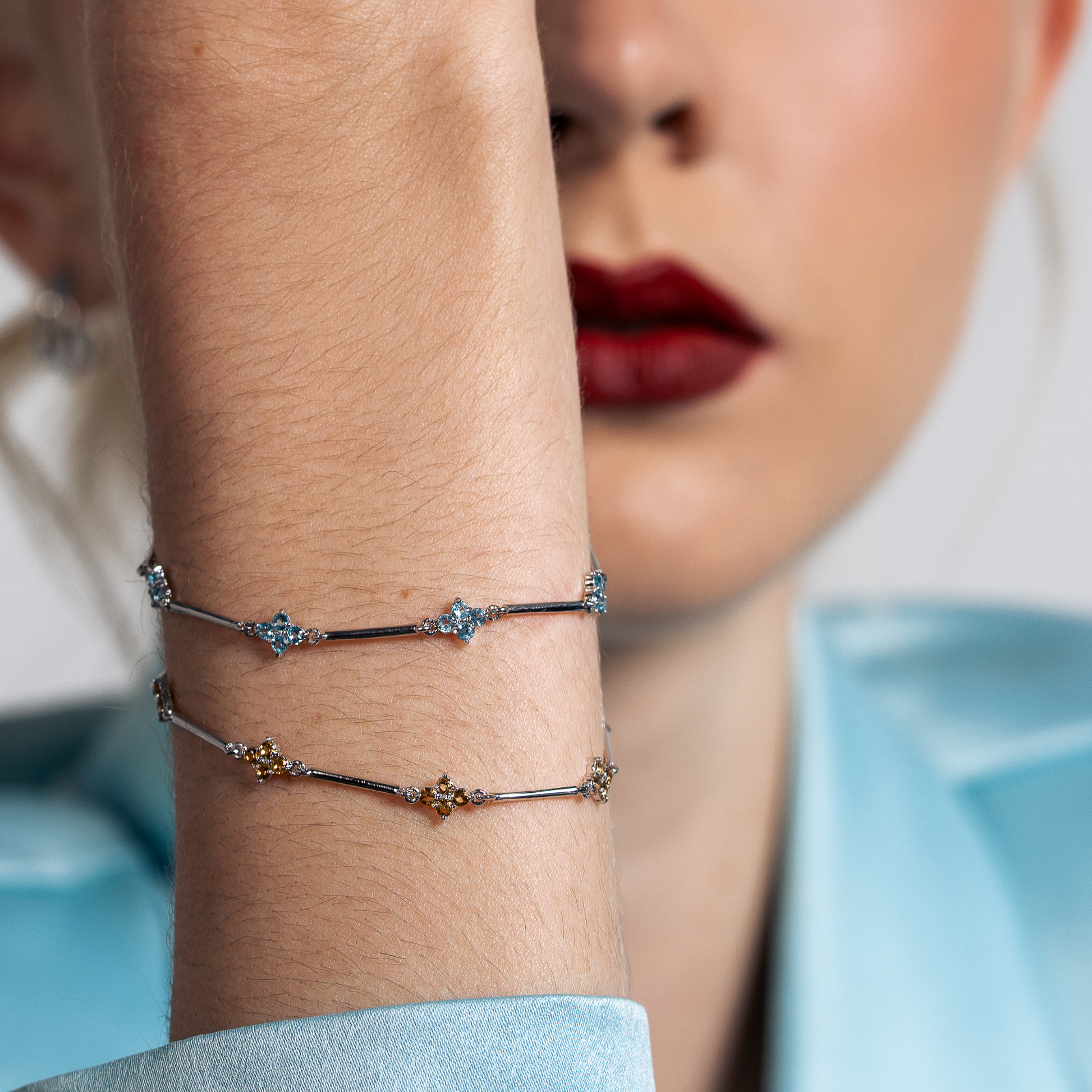 "Com design exclusivo, esta pulseira traz a energia e a alegria do Citrino em uma composição modular e vibrante. A gema irradia a luminosidade do sol, alternando com barras de metal para um visual moderno e cheio de vida.