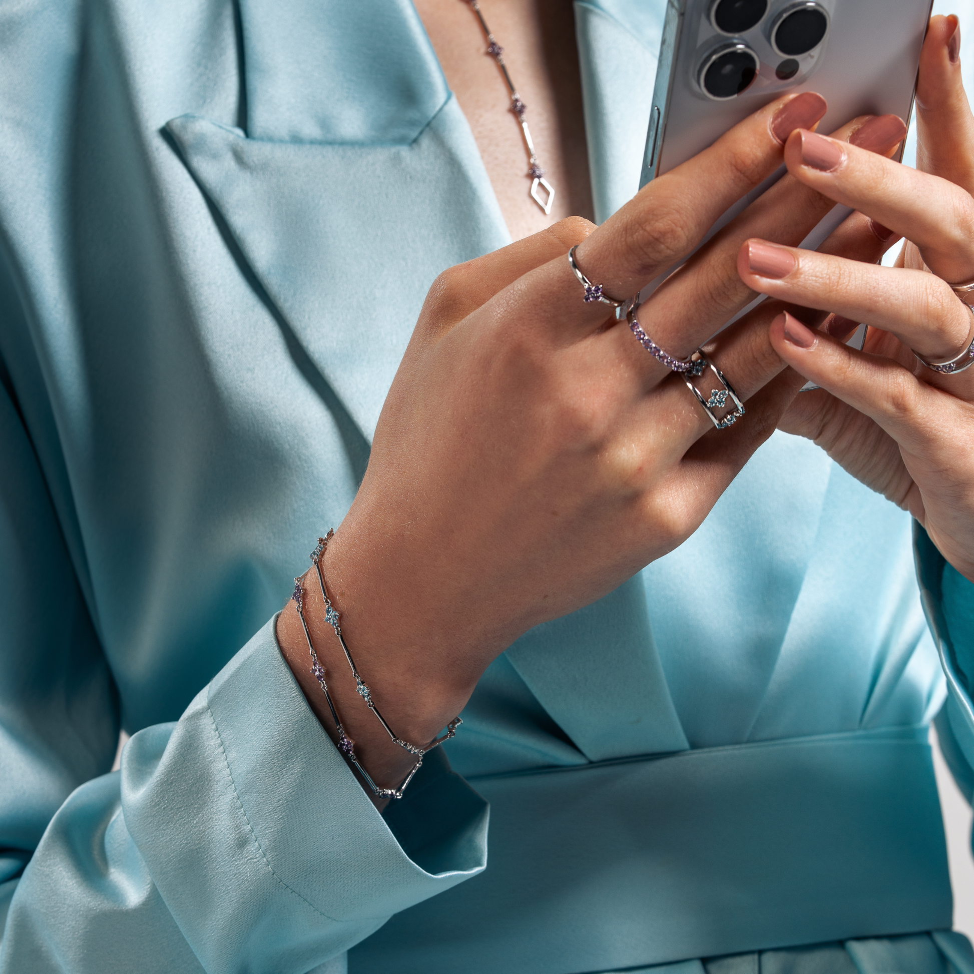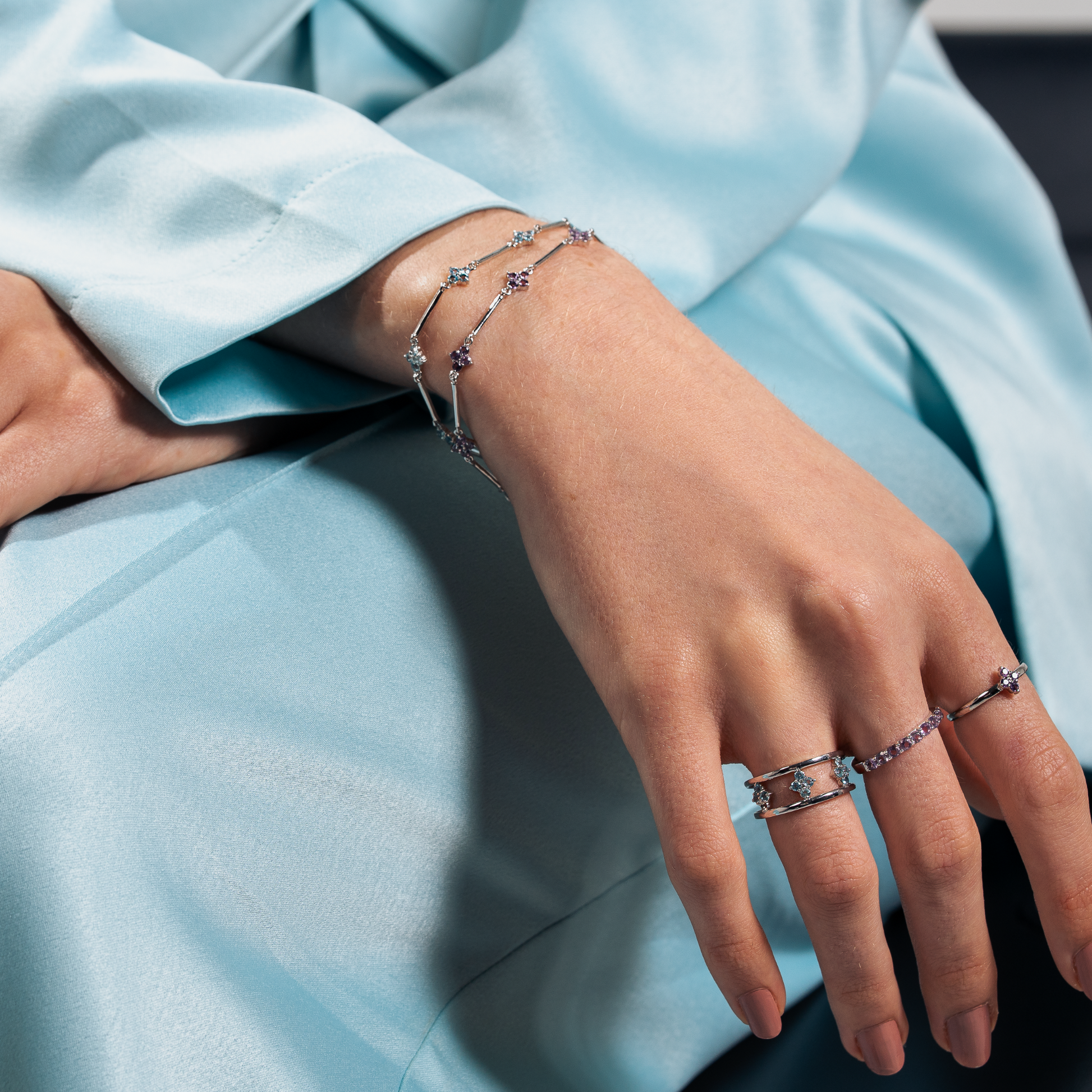 Esta pulseira apresenta um design exclusivo e delicado, combinando a elegância da Prata 925 com o brilho vibrante de gemas azuis.