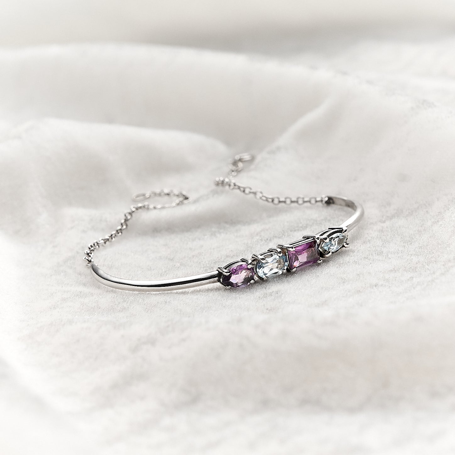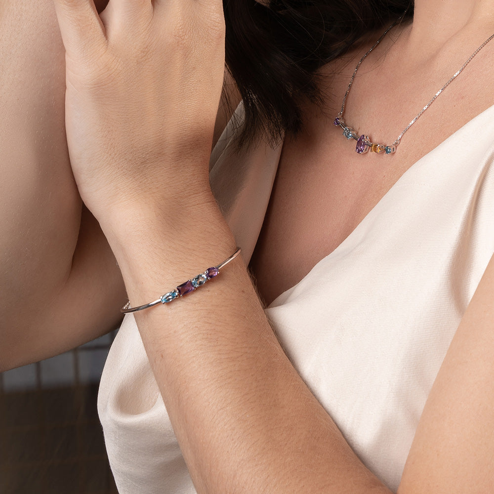 As gemas da coleção Colorful são verdadeiras expressões de beleza e vivacidade da natureza brasileira. Esta pulseira une a serenidade do Topázio Sky à nobreza espiritual da Ametista, apresentando uma composição rítmica de diferentes lapidações que capturam a luz de ângulos variados. Uma joia vibrante e sofisticada que ilumina o pulso com delicadeza e poder, perfeita para quem busca carregar a energia das cores naturais com um acabamento de alta joalheria.